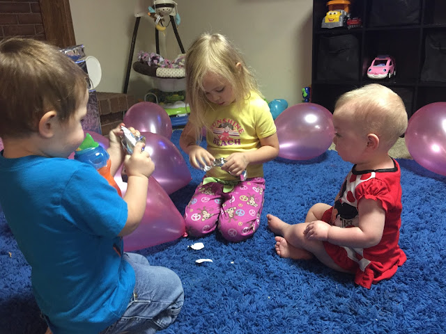 The kids were to excited about a birthday for Brooklyn and ALL day long Brooklyn was told Happy Birthday by the siblings. We of course had to wait for Daddy to get home from the patients house before opening presents so balloons was a fun distraction until then.