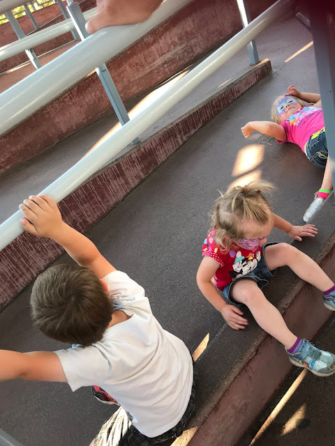 Mickeys Toontown we hadn't even like walked in yet so we decided we had to at least go their and let the kids explore the houses and of course Goofys playground because that is the best part. We let the kids play to their hearts content and then of course tried to convince the kids to go on the coaster in their because we have never rode it. Brooklyn was so cute and waved and rode off thinking it was going to be awesome, little did she know it was fast and she was a bit scared but it was oh so cute. Andie said it was fun after the fact but her initial thought was it was scary and she did NOT like it haha. Jake was too chicken and absolutely refused to even attempt the coaster that's when we knew there was no point in trying the rocky mountain railroad with him (which we had fast passes for haha).